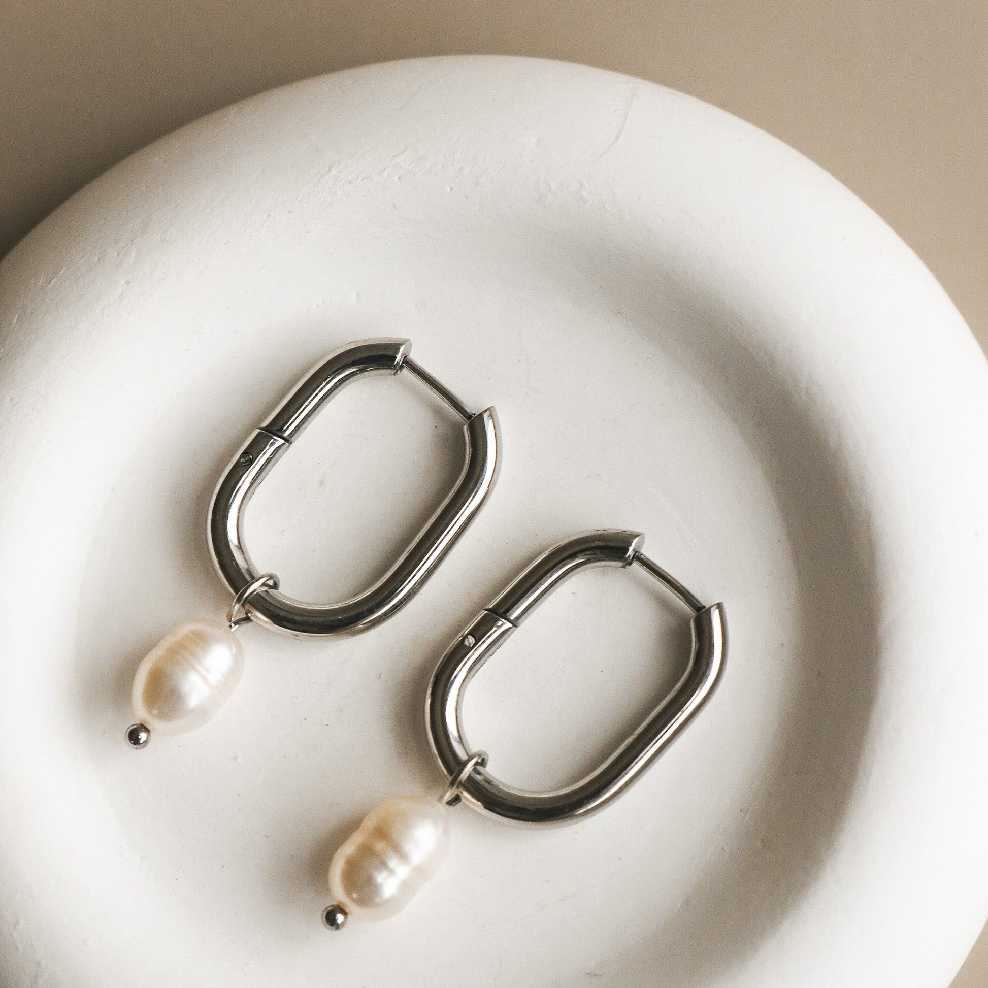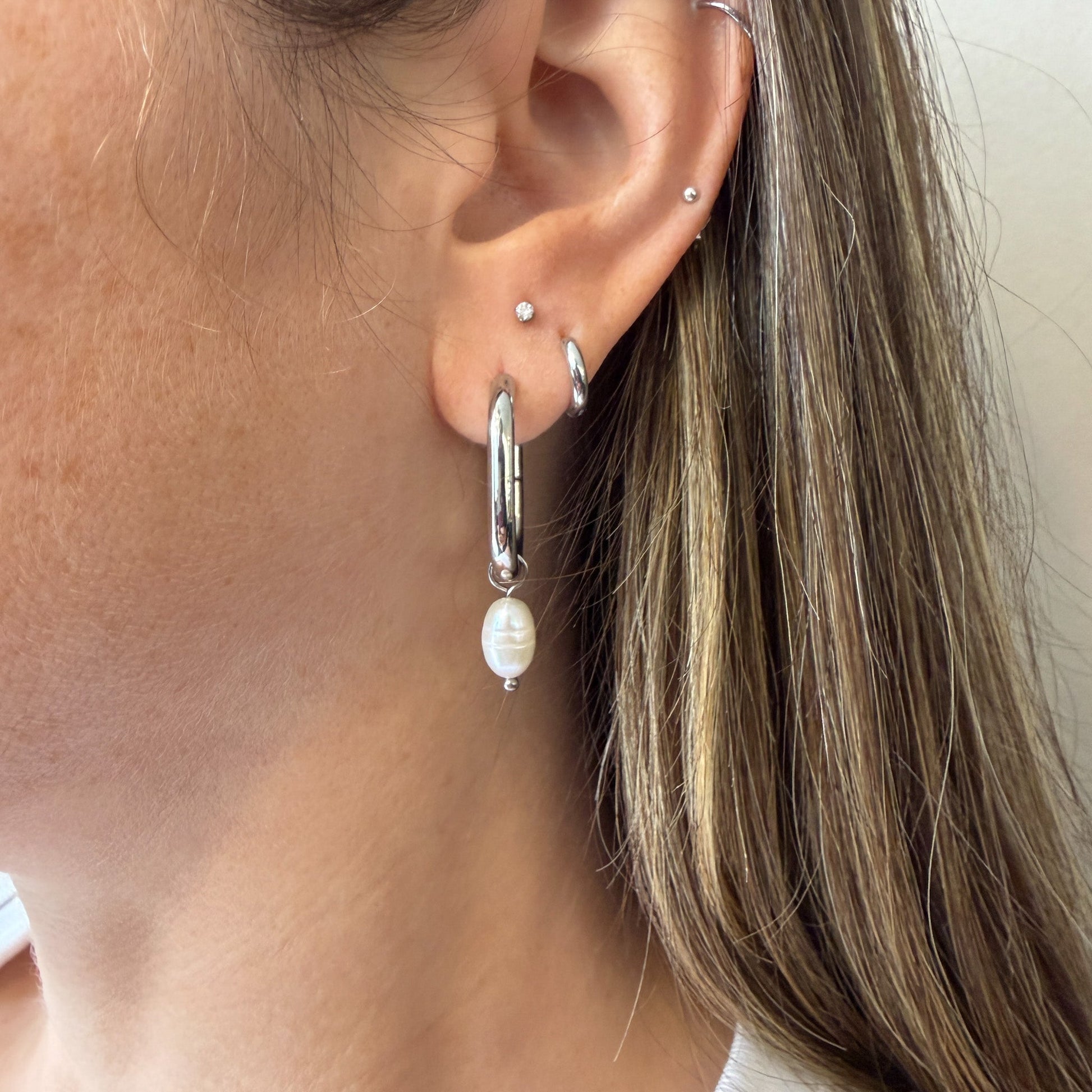 Boucles d'oreilles anneaux de forme ovale avec pendentif en perle d'eau douce.