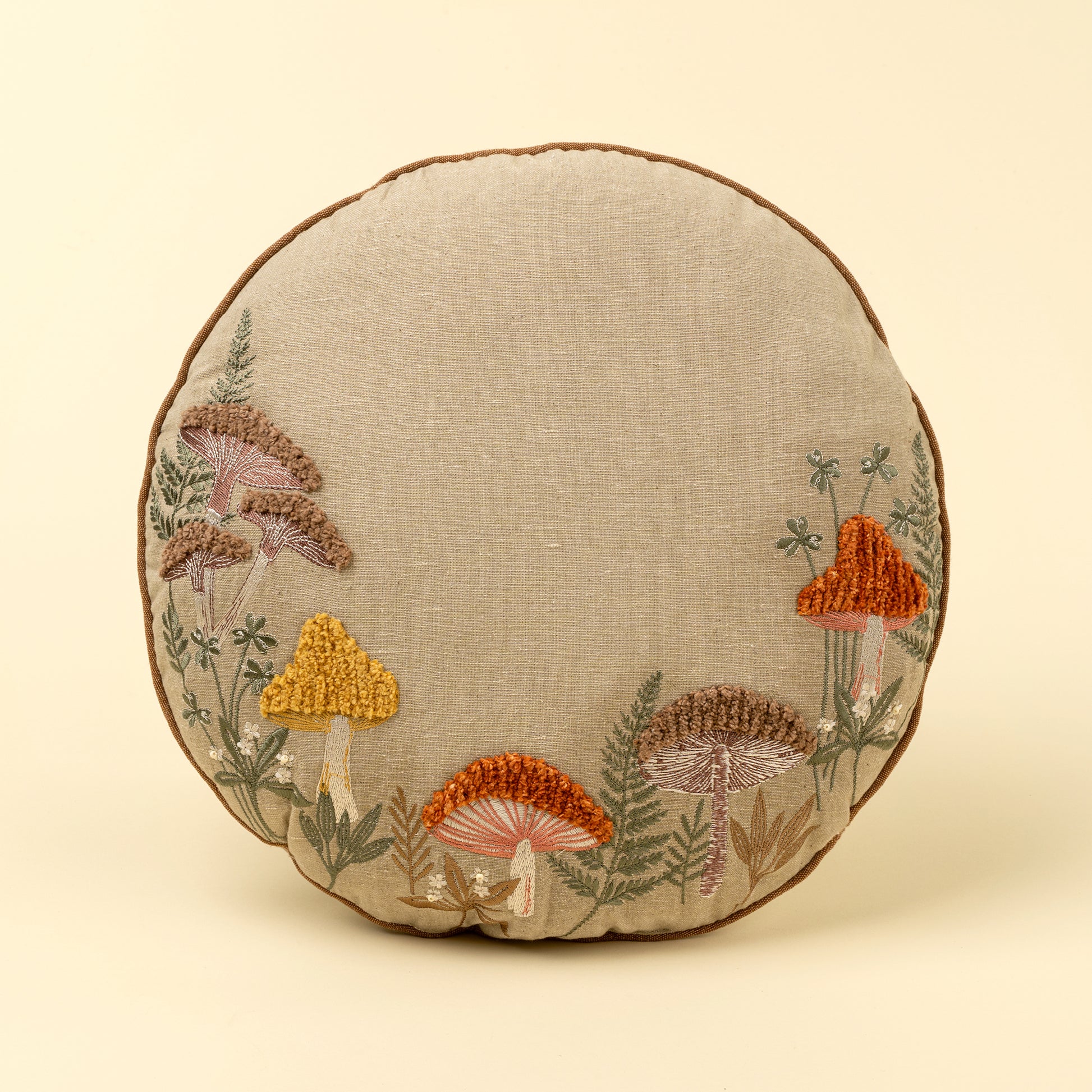 Apportez une touche de charme forestier à votre intérieur avec ce coussin rond magnifiquement brodé.